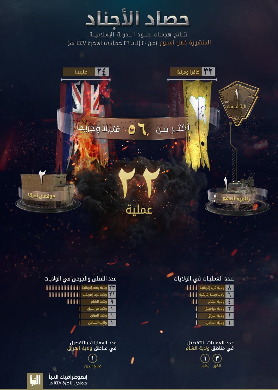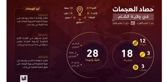 In this issue of al-Naba, the Islamic State published an infographic dedicated to attacks carried out by militants in the province of Sham (Syria) between 15 November and 14 December 2025.