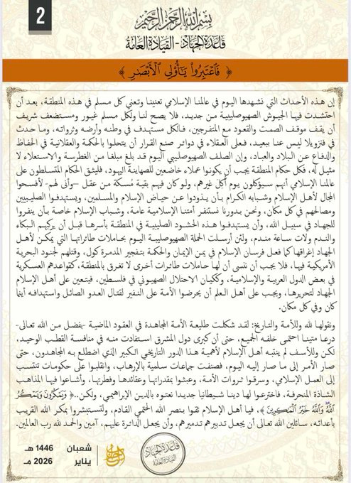 Primary Source Analysed: Official central leadership statement to al-Qaeda core, released via jihadist media distribution channels in 2026 (Hijri 1446).