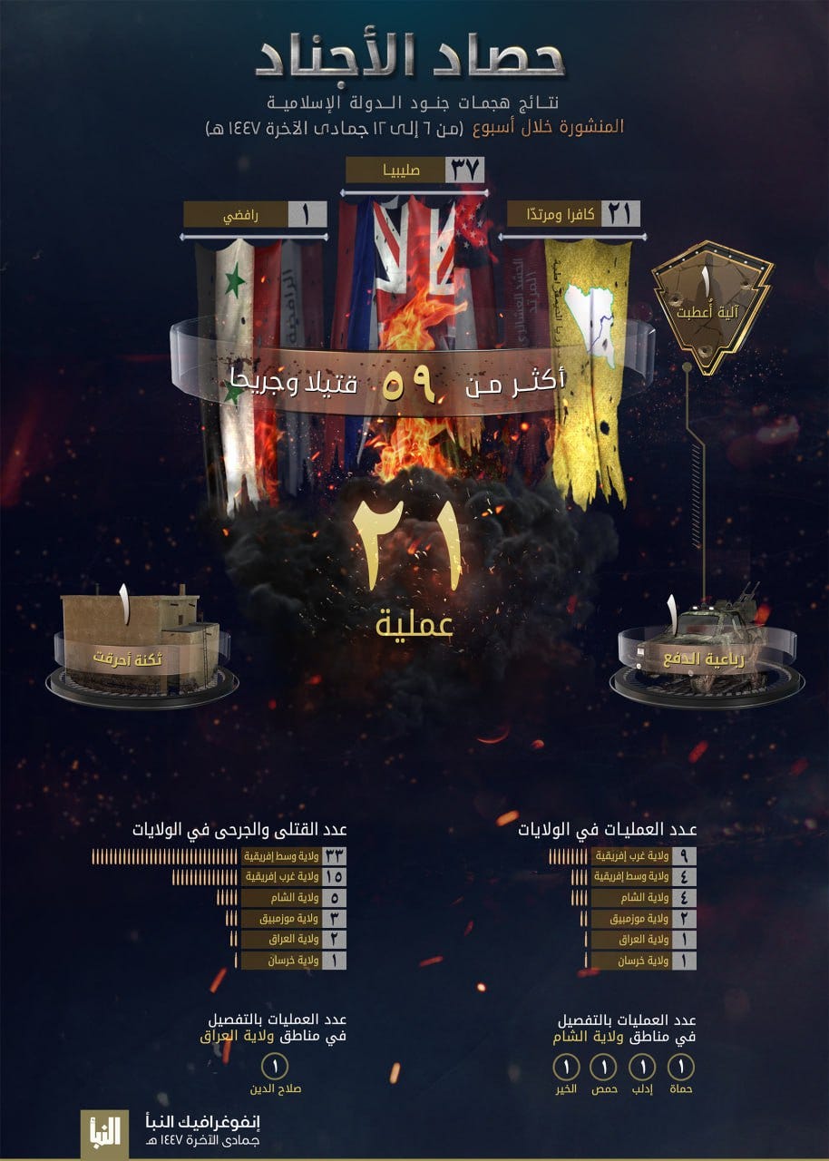 The official media of the Islamic State published 1 issue of the weekly al-Naba this week (524). Issue 524, eight pages long, covers the week of 29 Jumada al-Awwal al 5 Jumada al-Akhira 1447, from 27 November to 3 December 2025. The main infographic summarises the areas affected by military operations during the week mentioned above: Nigeria, Syria, Mozambique, Afghanistan, Iraq and the Democratic Republic of Congo. IS claims to have conducted 21 operations in all the mentioned areas and to have caused 59 deaths and injuries (for more details, read here).
