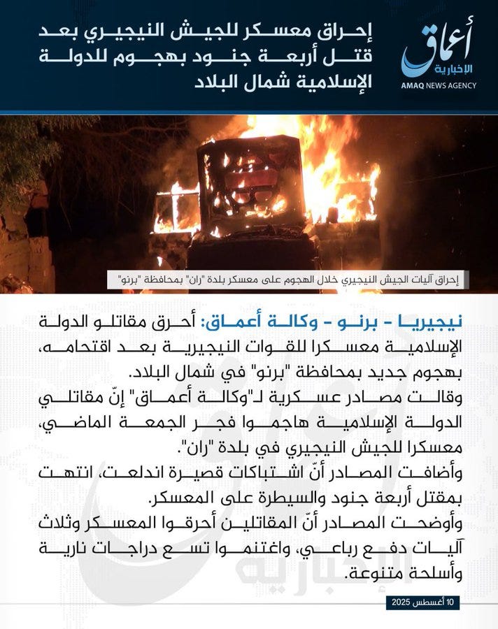 Amaq News Agency, the official media of the Islamic State, issued a lengthy statement claiming an attack by militants from West Africa Province (ISWAP) on a Nigerian army camp in the Rann area of Borno State. Nigeria