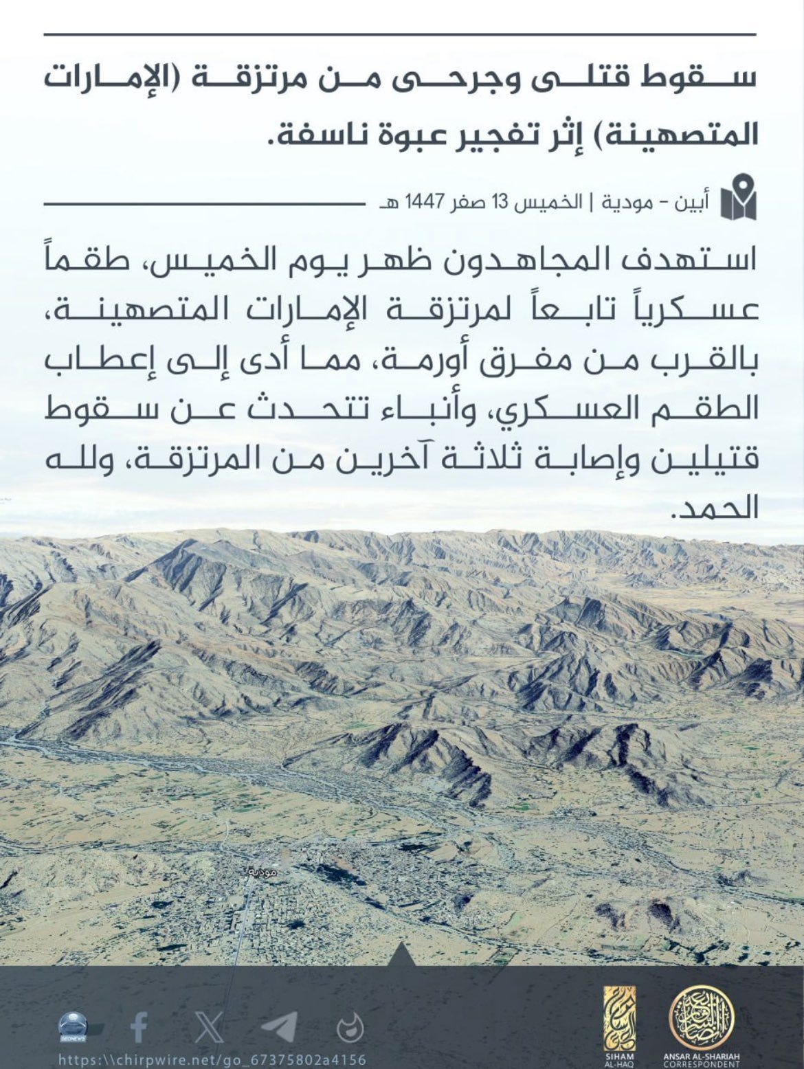 Al-Qaeda in the Arabian Peninsula (AQAP) published 2 statements and 1 photo to claim 2 attacks using IEDs and drones.