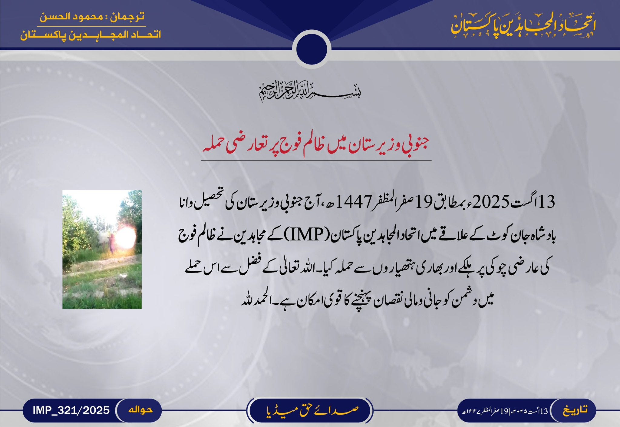 Ittehad-ul-Mujahideen Pakistan (IMP), a Pakistani jihadist organisation comprising the Hafiz Gul Bahadur Group (HBG), Lashkar-e-Islam and the Harkat Inqilab-e-Islami Pakistan (HIIP), released 41 statements, claiming 44 attacks.