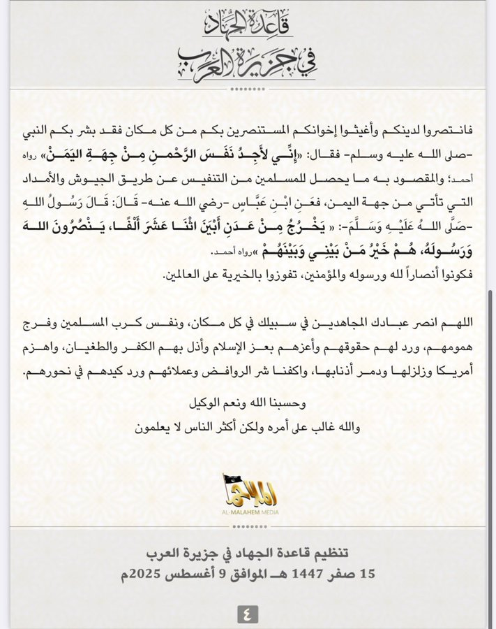 Al-Malahem Media, al-Qaeda in the Arabian Peninsula (AQAP) issued a four-page statement regarding the latest events in Hadramawt, in which it set out its position on what is happening in the governorate, stating that the popular protests represent a “revolt against injustice and tyranny”, describing the situation as “an inevitable consequence of arrogance, the spread of unbelief, corruption and the plundering of resources”. The statement includes a call to the people of Hadramawt and Yemen to “continue the action until the tyrants and traitors are removed and Sharia law is established”, as well as to “drive out Americans and Zionists, free prisoners, and stop the looting of oil and resources”. The statement also encourages the population to “prepare and arm themselves”.