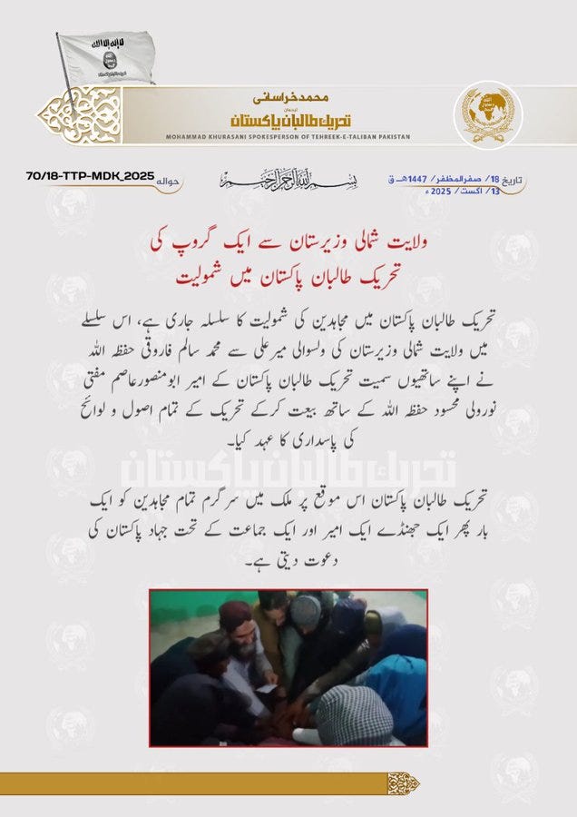 Mohammad Khurasani, spokesman of the Tehreek-e-Taliban Pakistan (TTP), issued a statement announcing that Muhammad Saleem Farooqi Hafzaullah of the Mir Ali district of North Waziristan province, together with his fighters, had sworn allegiance to the TTP.