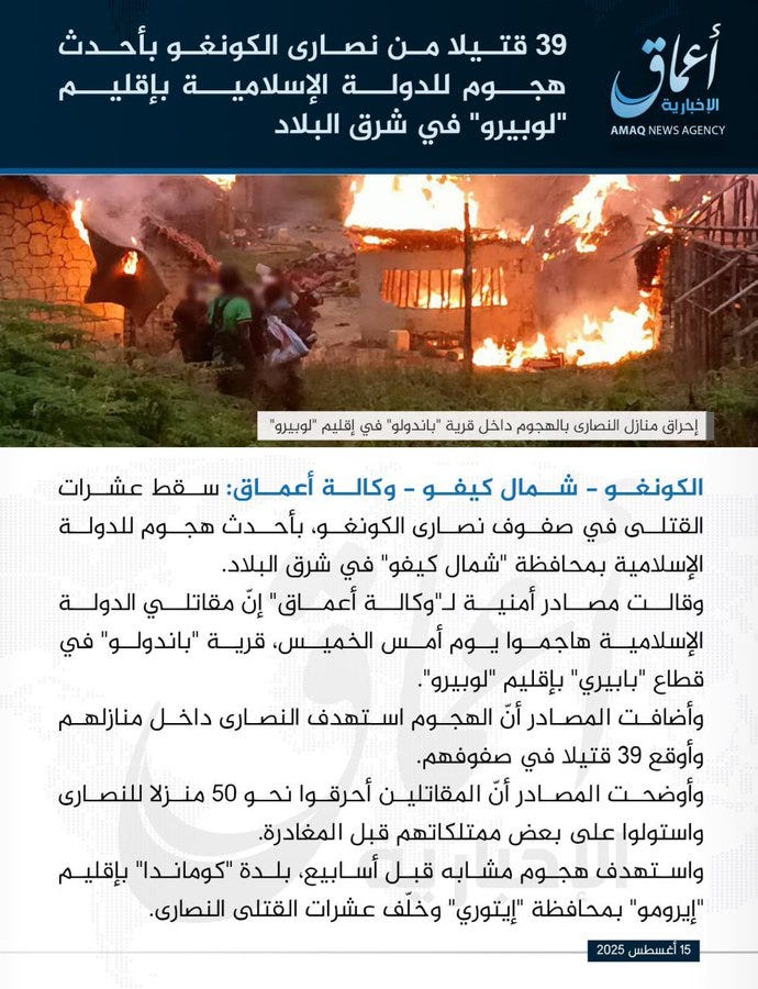 The Amaq News Agency, official media of the Islamic State, issued a lengthy statement claiming an Islamic State Central Africa Province (ISCAP) attack on a Christian village in the Lubero area of North Kivu province, Democratic Republic of Congo. The statement claims that ISCAP militants killed 39 Christian civilians and burned 50 houses.