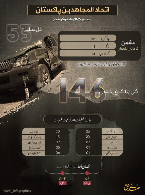 Ittehad-ul-Mujahideen Pakistan (IMP), a Pakistani jihadist organisation comprising the Hafiz Gul Bahadur Group (HBG), Lashkar-e-Islam and Harkat Inqilab-e-Islami Pakistan (HIIP), published an infographic summarising its military operations for the month of September 2025.