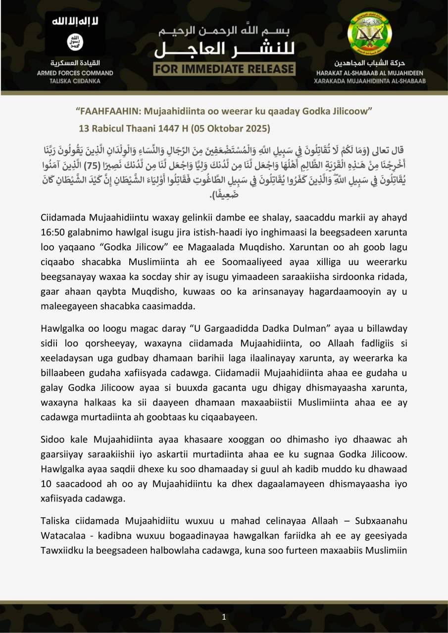 Al-Kataib Media, Harakat al-Shabaab al-Mujahidin (AS) released a statement from its military leadership claiming responsibility for the massive attack on the intelligence centre and prison in Godka Jilikov, in the capital, Mogadishu. Somalia