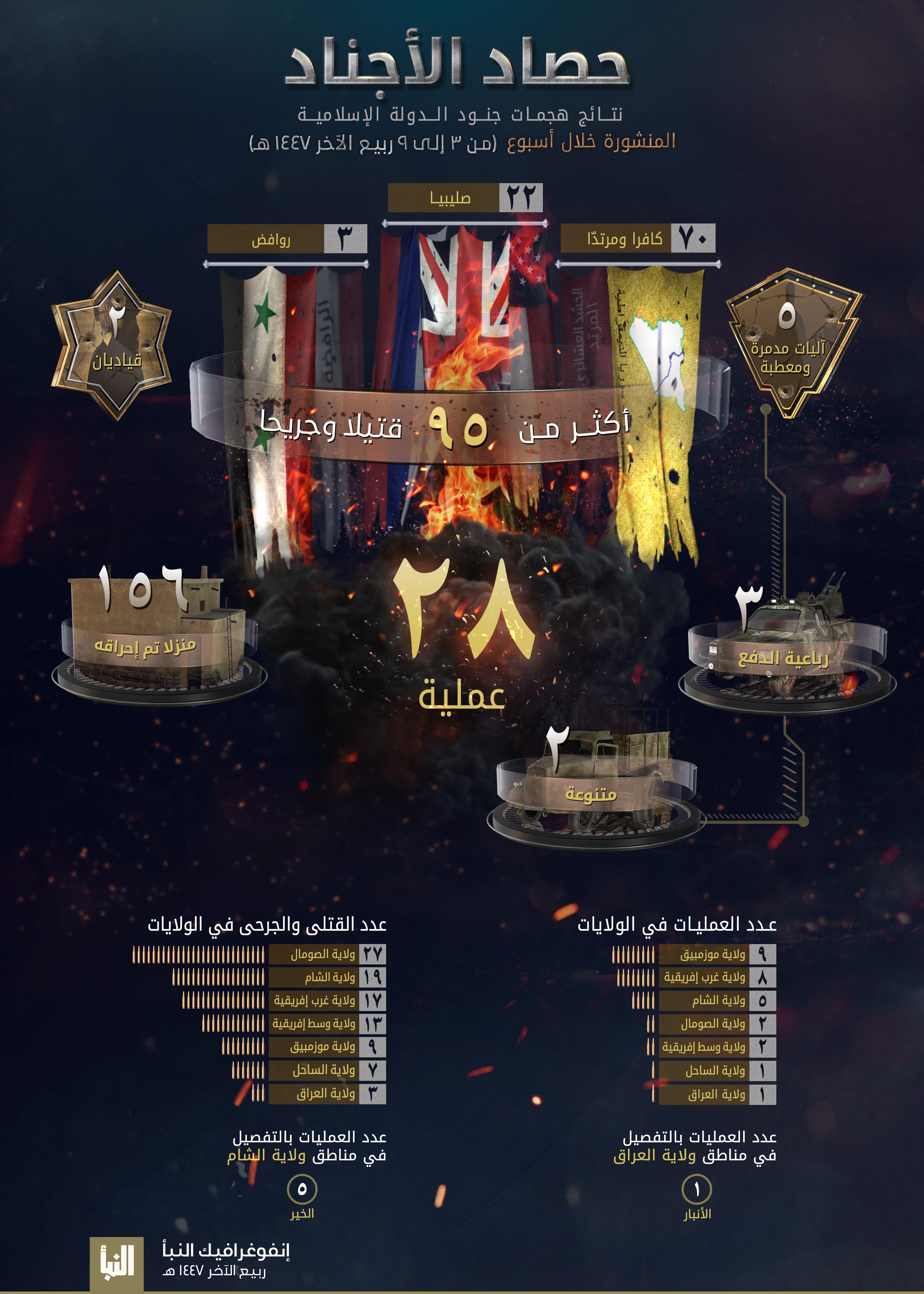 The official media of the Islamic State published 1 issue of the weekly al-Naba this week (515). Issue 515, eight pages long, covers the week of 3 to 9 Rabi al-Thani 1447, from 1 25 September to 1 October 2025. The main infographic summarises the areas affected by military operations during the week mentioned above: Nigeria, Niger, Syria, Somalia, Mozambique, Iraq and the Democratic Republic of Congo. IS claims to have conducted 28 operations in all the mentioned areas and to have caused 95 deaths and injuries (for more details, read here).