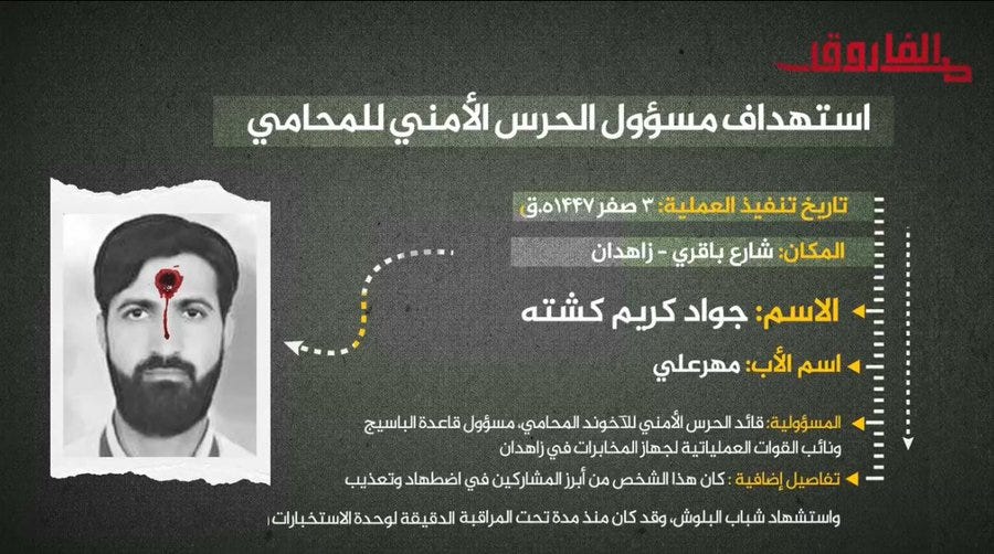 Ansar al-Furqan, an Iranian jihadist group active in the provinces of Sistan and Balochistan and Kuzhestan, released a video statement claiming the killing of the Basij base chief and deputy of the IRGC intelligence operation forces in Zahedan. Iran