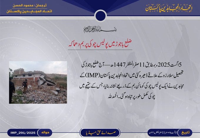 Ittehad-ul-Mujahideen Pakistan (IMP), a Pakistani jihadist organisation comprising the Hafiz Gul Bahadur Group (HBG), Lashkar-e-Islam, and Harkat Inqilab-e-Islami Pakistan (HIIP), published an infographic summarising its military operations for July 2025.