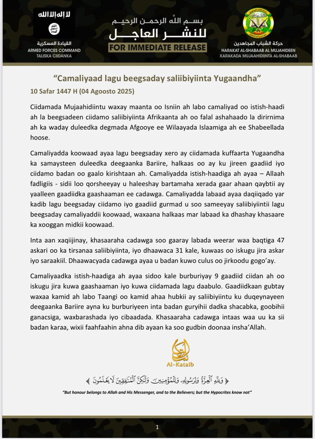 Al-Kataib Media, Harakat al-Shabaab al-Mujahidin, published a statement by the military leadership in which it claimed two major attacks (first with suicide bombers and then with armed assaults) against a Ugandan Army camp and convoy on the outskirts of the Afgooye district in the Lower Shabelle region. Somalia. In the statement, they claim the killing of 47 soldiers.
