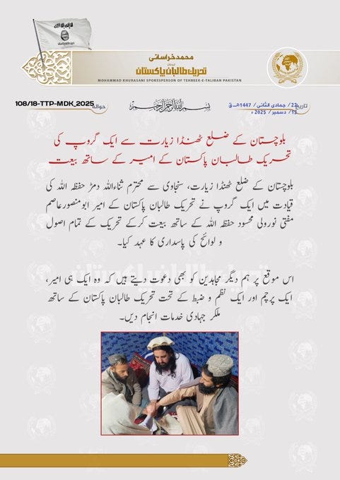 Mohammad Khorasani, spokesperson for Tehrik-e-Taliban Pakistan (TTP), announced in a statement that jihadist groups from the district of Ziarat (Balochistan province) have pledged allegiance to Tehreek-e-Taliban Pakistan and its emir, Abu Mansoor Asim Mufti Noor Wali Mehsud Hafizullah. Pakistan