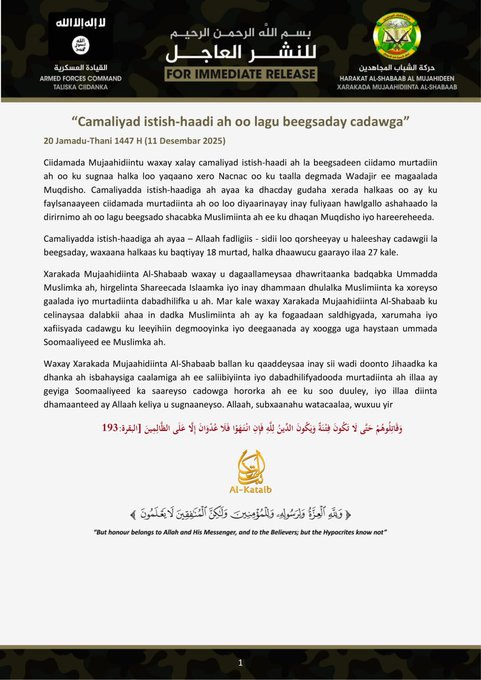 The statement concludes with a pledge to continue attacks against government forces and the international coalition until “their withdrawal from all Somali territory.” Somalia