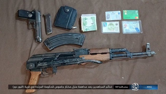 The official media of the Islamic State (IS) published a photo reportage by militants in the Iraqi province showing the capture and killing (and seizure of his documents and weapons) of a civilian described as a government “spy” in the governorate of Salah al-Din, Iraq.