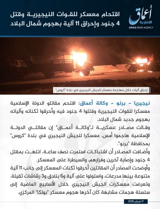 Amaq News Agency, the official media of the Islamic State, published a lengthy statement claiming a major attack by West African militants (ISWAP) against a Nigerian army camp in the Cross Kawua area of Borno state. Nigeria
