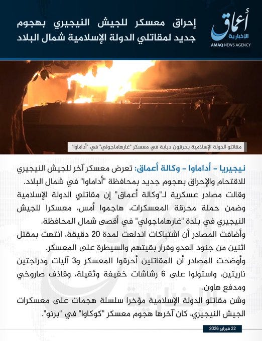 Amaq News Agency, the official media of the Islamic State, published a lengthy statement claiming a major attack by West African militants (ISWAP) against a Nigerian army camp in Adamawa state. Nigeria