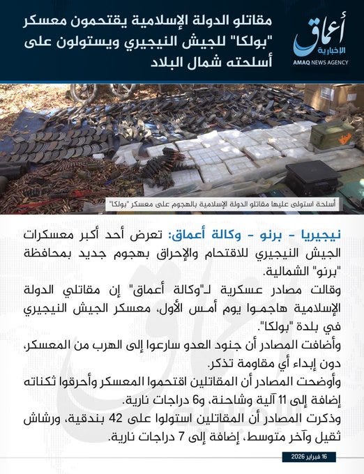 Amaq News Agency, the official media of the Islamic State, published a lengthy statement claiming a major attack by West African militants (ISWAP) against a Nigerian army camp in the Pulka area of Borno state. Nigeria