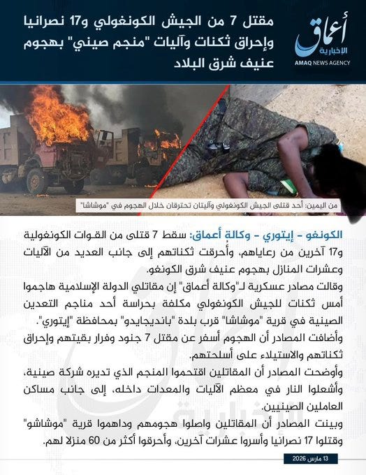 The Islamic State’s official media outlets have released photos of the ISCAP attack on a Chinese mining company in the Mambasa area, Ituri province, in which Congolese army soldiers were killed, and mining infrastructure was destroyed. DR Congo