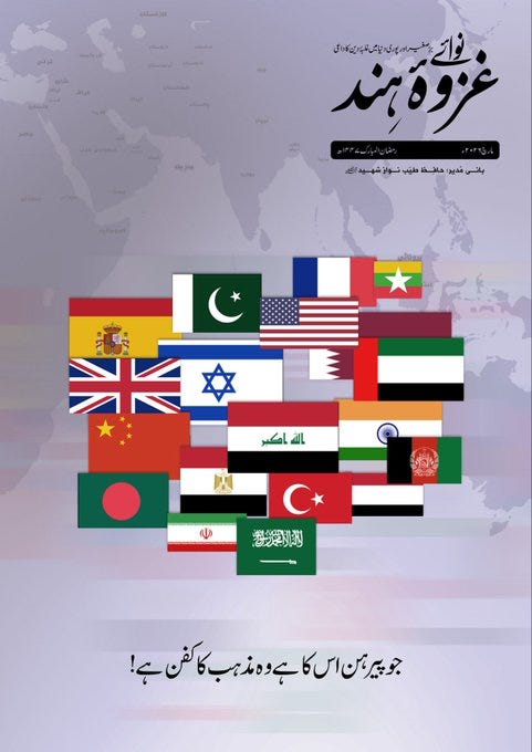 The main text states that the countries listed on the cover are part of a front hostile to Islam and responsible for actions against Muslim communities in various regions of the world. The editorial also links regional dynamics on the subcontinent with conflicts in the Middle East and Afghanistan, presenting them as interconnected fronts in the same war. Among the topics covered are the situation in Afghanistan following the Taliban’s return to power, the Kashmir issue, relations between Pakistan and militant groups, and the role of the United States in the region. The publication includes articles encouraging ideological and operational support for the jihadist cause in the subcontinent. These texts call on readers to support jihad through propaganda, logistical support, or direct participation in the conflict.