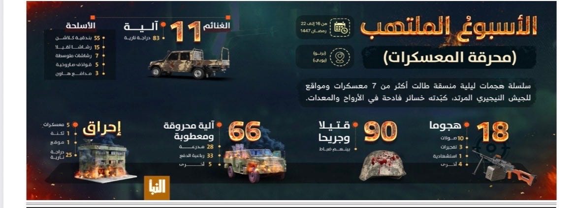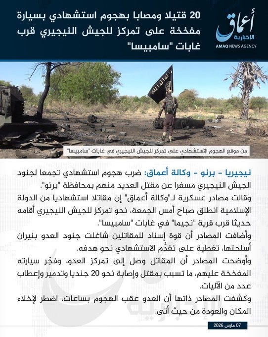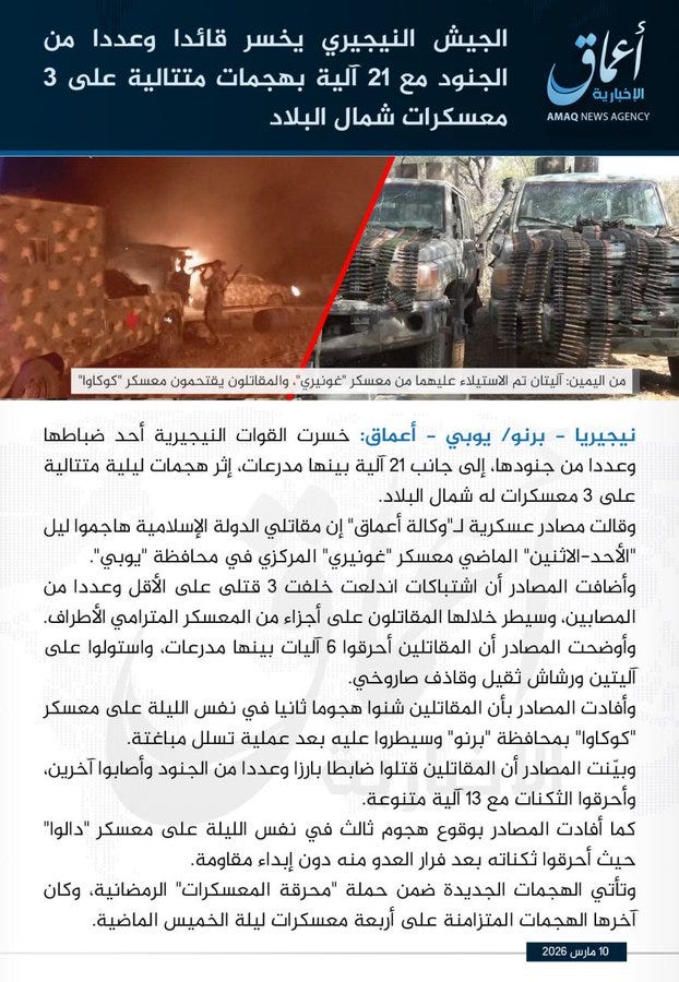 The Islamic State’s official media maintained a structured, aggressive reporting rhythm. Al-Naba issue 538 provided the standard weekly summary of operations across Nigeria, Niger, Syria, Somalia, Pakistan, and the Democratic Republic of Congo. Supporting releases from Amaq and official provincial outlets were heavily concentrated on West Africa, especially Borno and Yobe states, where ISWAP claims dominated the week’s visual and textual output. The volume of attack videos and detailed statements from Nigeria stood out, particularly around repeated attacks on army camps and convoy targets. ISCAP also received notable media attention through a coordinated claim-and-photo package documenting an attack on a Chinese-linked mining site in Ituri. Overall, Islamic State media this week remained highly standardised in structure but intensive in release volume and geographically coherent in its prioritisation of West and Central Africa.