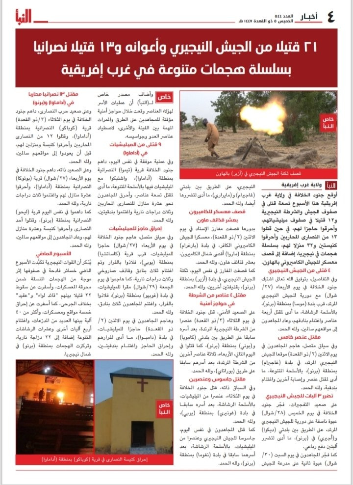 On the fourth page, the weekly magazine goes into detail about the types of attacks, operations, and targets of Islamic State fighters, who follow two main strategies: “war of attrition” and “economic warfare”, as well as other methods aimed at targeting Christians and Shiites. Since 20 March 2025, the Islamic State has embarked on a new military campaign, particularly in Africa (in the areas of Nigeria, Niger, Cameroon, and Mozambique) called “Burning Camps”.