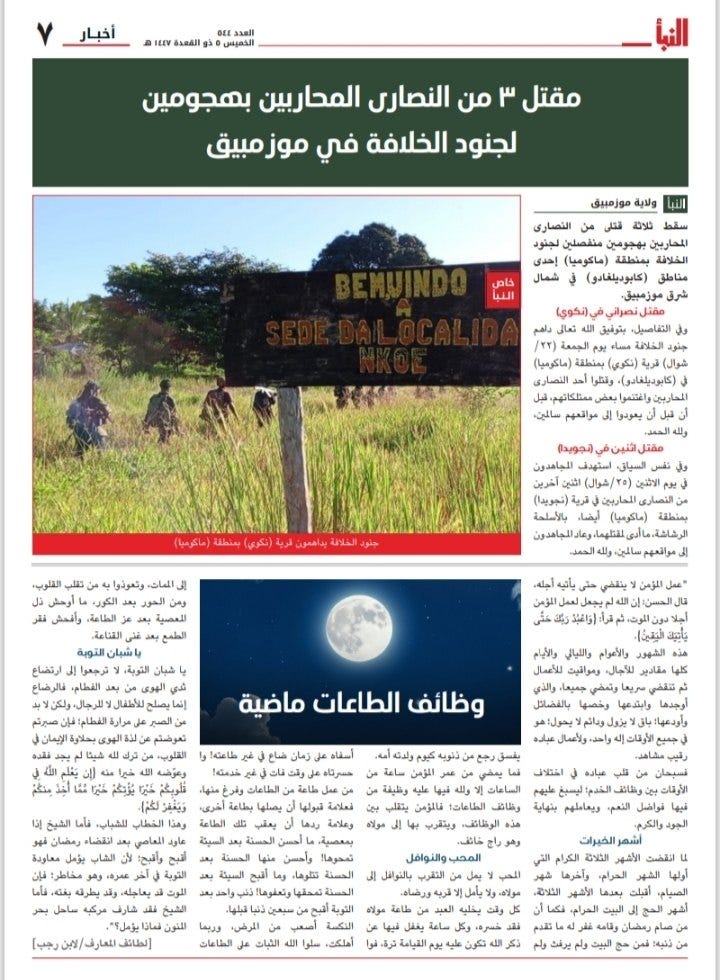 5) Mozambique Province: The weekly al-Naba reports on 2 operations carried out by ISM militants against two positions held by pro-government militias in the Macomia district of Cabo Delgado Province.