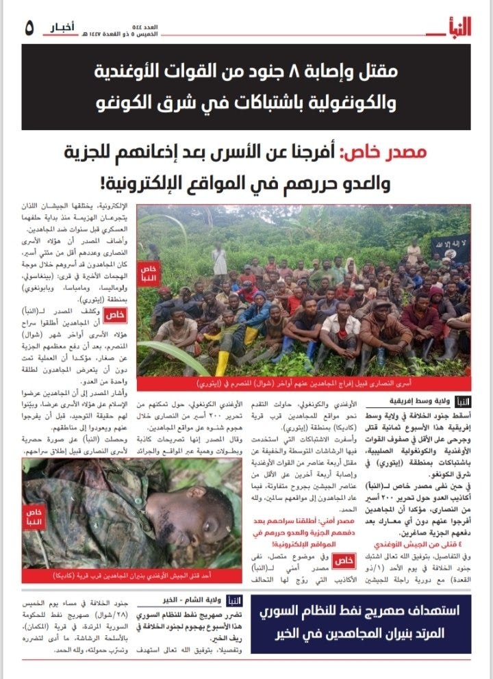 2) Central Africa Province: The weekly al-Naba reports on 1 attack carried out by ISCAP militants against a joint Congolese and Ugandan army patrol in Ituri Province, in the Democratic Republic of the Congo.