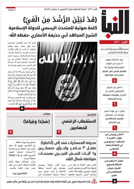 Al-Naba generally includes most of the statements and photos published daily over the past week on its official channels, although often with new elements or additional details, both written and photographic. However, al-Naba won’t include unpublished statements or messages.