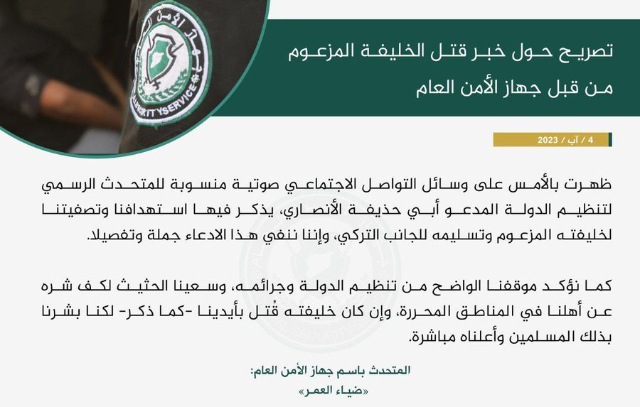 On the evening of 4 August, the General Security Service (GSS), the HTS security service, stated its media denying responsibility for the killing of the IS leader and that it had then collaborated with Turkey, but confirming that its mission to fight and eradicate the Islamic State ('the criminal organisation') in the areas they control will continue.