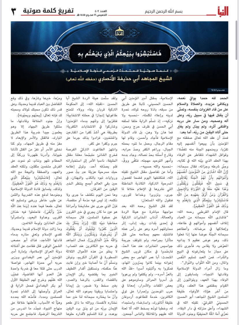 The audio announcement by al-Furqan Media Foundation was then published in full a few hours later in issue 402 of the weekly al-Naba.