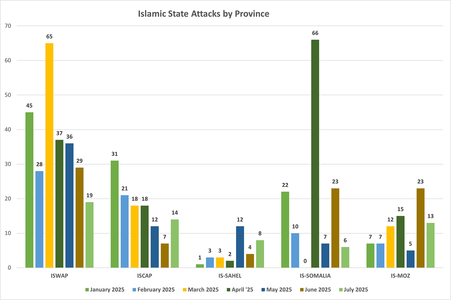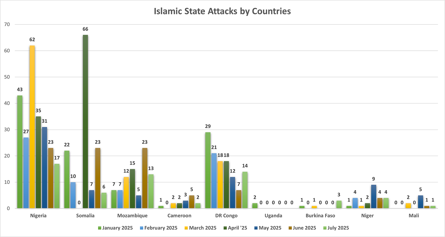 An assessment of Islamic State military activity in Africa this month shows a decline of about 30% in the number of attacks, but shows an increase in the areas affected, particularly with attacks this month in two regions of Burkina Faso and attacks in a new district of Mozambique (Chiùre). The coming months of 2025 will be more indicative of the trend in attacks.