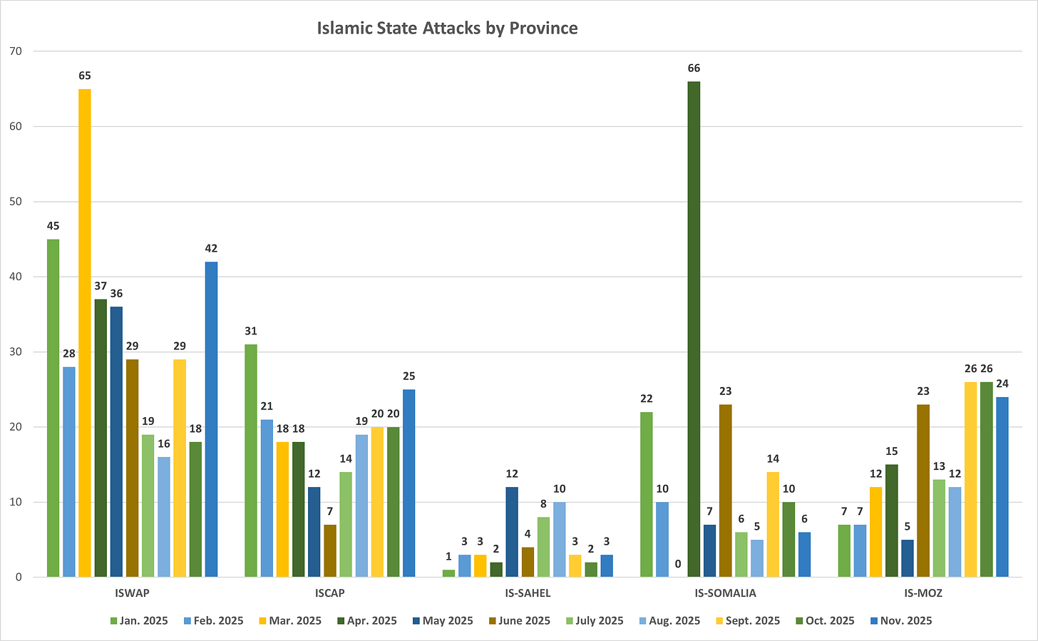 As of November 2025, the Islamic State maintains 5 active provinces in Africa, collectively demonstrating: