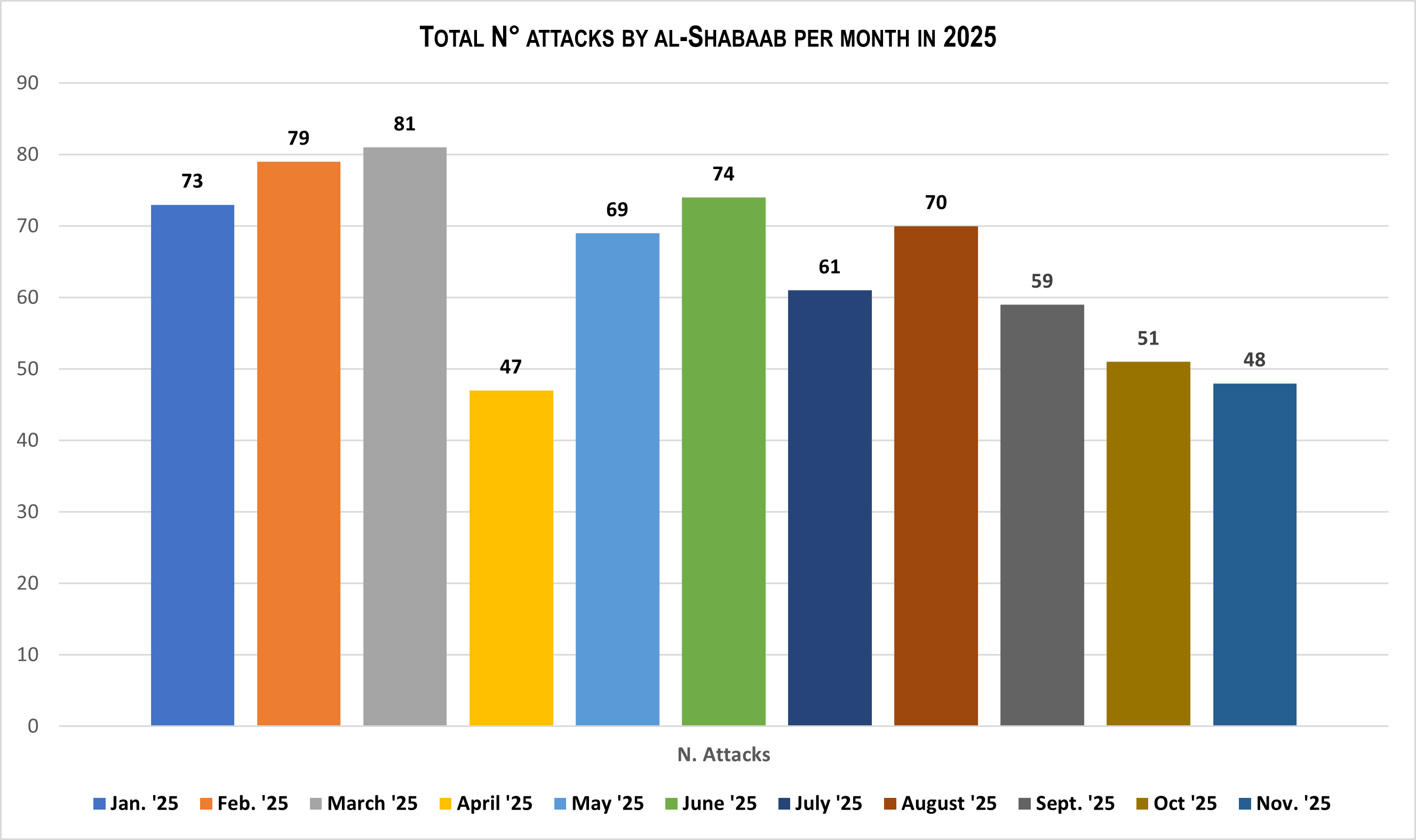 Overall, the November 2025 data indicate that al-Shabaab is neither on the defensive nor simply containment. On the contrary, the group is showing consistent signs of strategic adaptation, geographic focus, and qualitatively strengthening its operations.